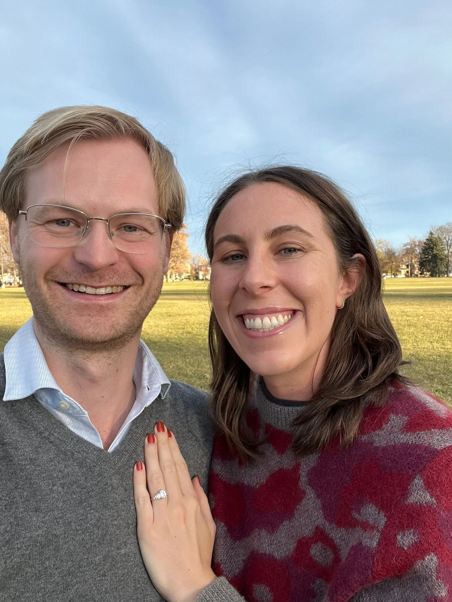 Abbie was only planning on being in Denver for one month and it was still the height of the pandemic so she wasn’t taking dating too seriously, thinking there would be no way she’d meet someone. Eduard’s Bumble profile suggested meeting in Washington Park for a glass of wine and being Abbie’s type (tall, blonde and European), she agreed to a Covid friendly meet up. After that date, they kept spending more and more time together until it was clear this needed to go on much longer than just a month. This then led to the pair traveling and living all over the United States during Covid, before settling down in Boulder, CO and getting their cat Wally.